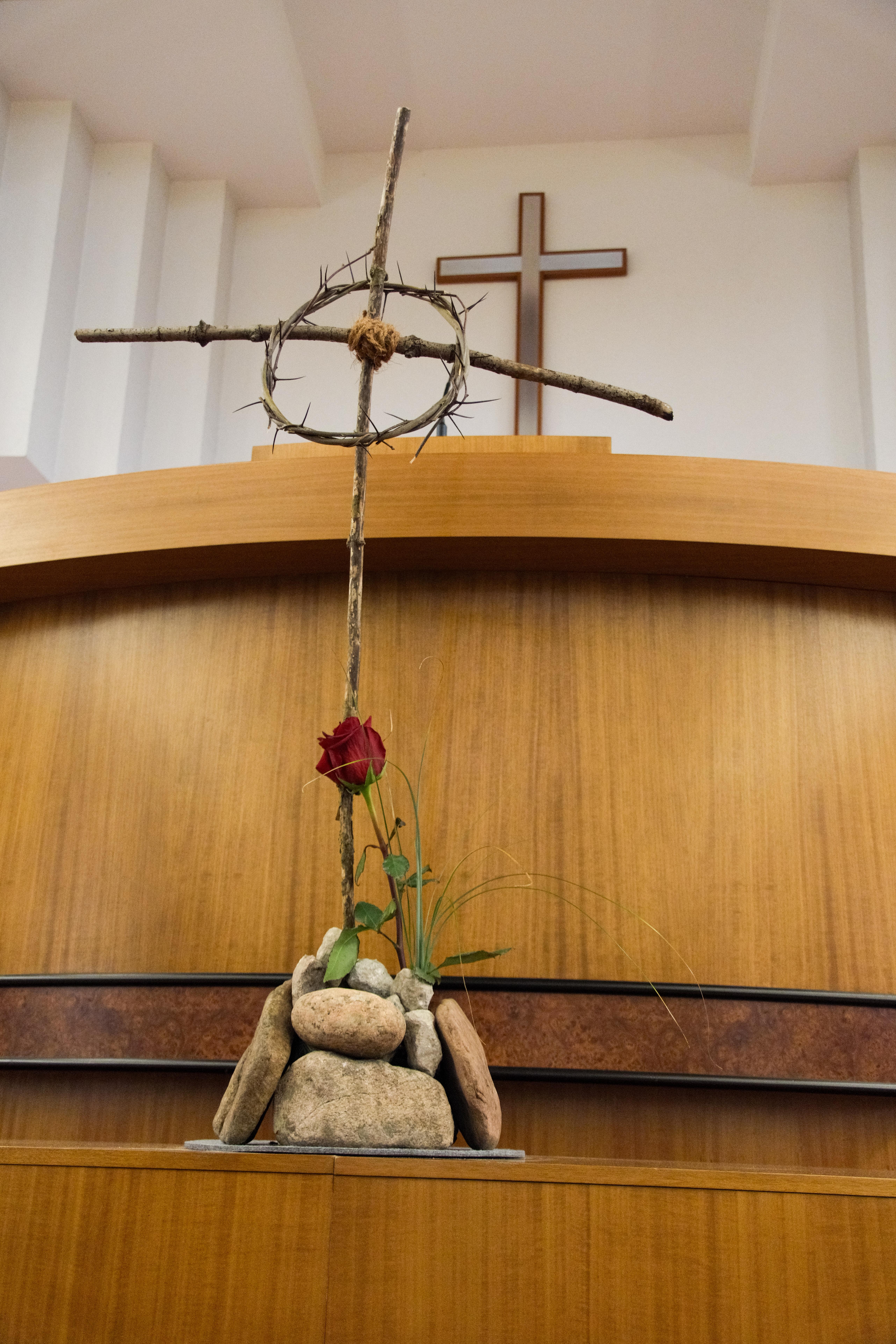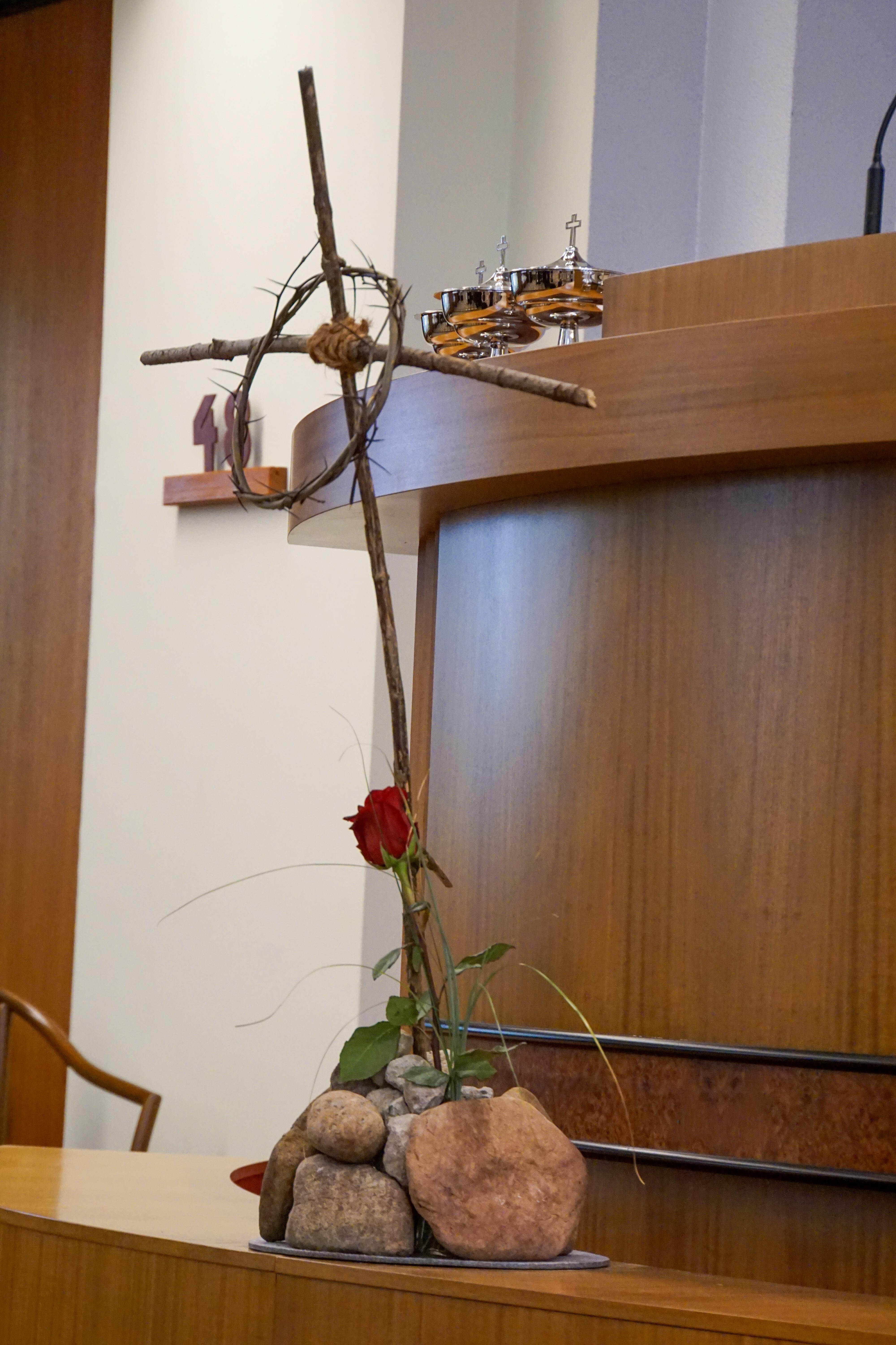 Als zweiten Mitdienenden bat Bezirksapostel Heynes Apostel Helmut Kasper an den Altar. Dieser griff den Blumenschmuck auf, der ein schlichtes Kreuz mit einer Dornenkronen als zentrales Element enthielt. Apostel Kasper erläuterte, dass dieses Kreuz sich nicht durch Schönheit und Ästhetik auszeichne, sondern symbolisiere, worum es im Kern ginge – und dies, so der Apostel, sei unsere Aufgabe: Hinzuschauen und zu erkennen, dass dieses Kreuz für den Sieg Christi steht und für seine unendliche, alle einschließende Liebe zu uns. Sie sei das trotz all unserer Fehler und Schwächen das verbindende Element zwischen Gemeindemitgliedern. Diese Liebe gelte es anzunehmen.