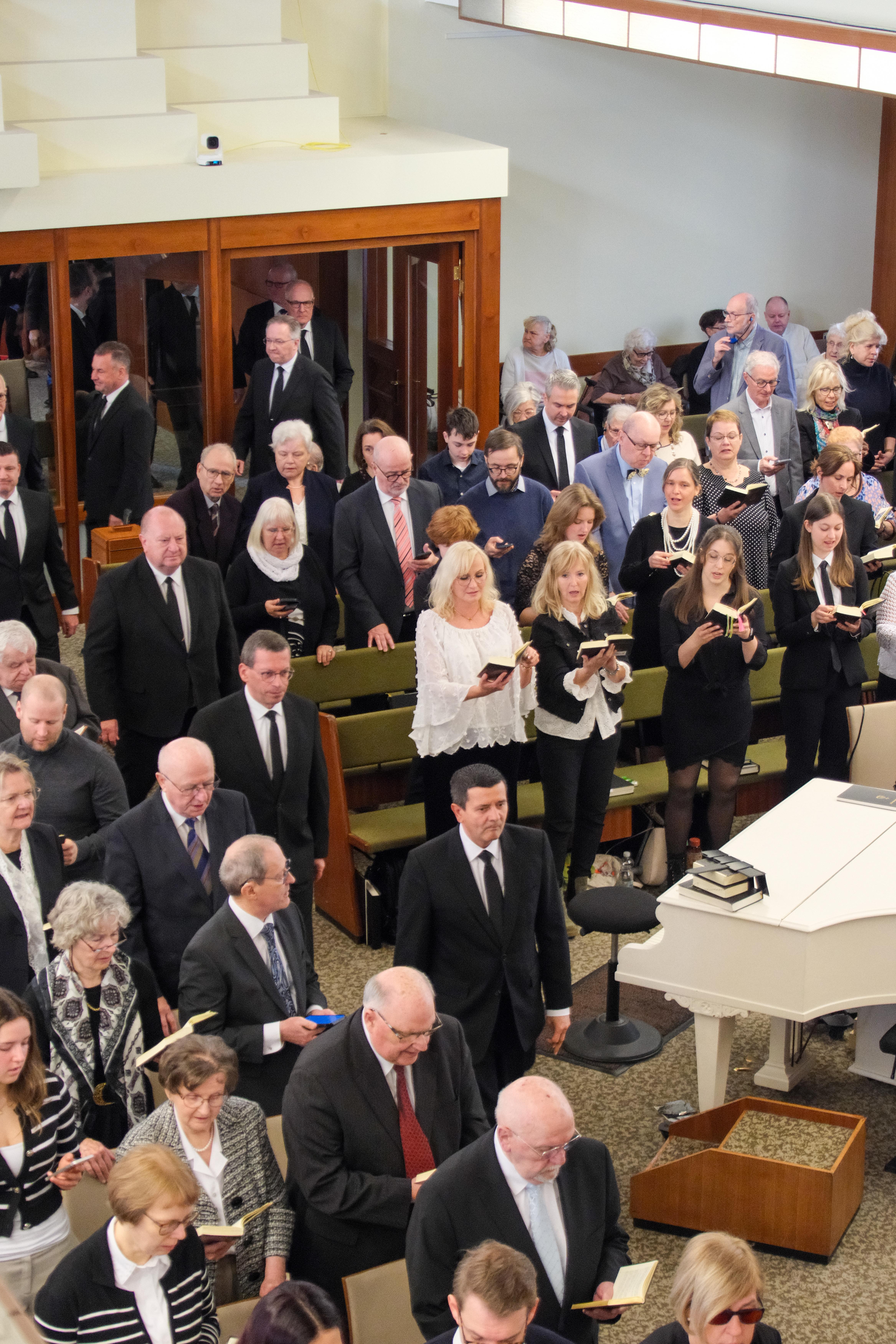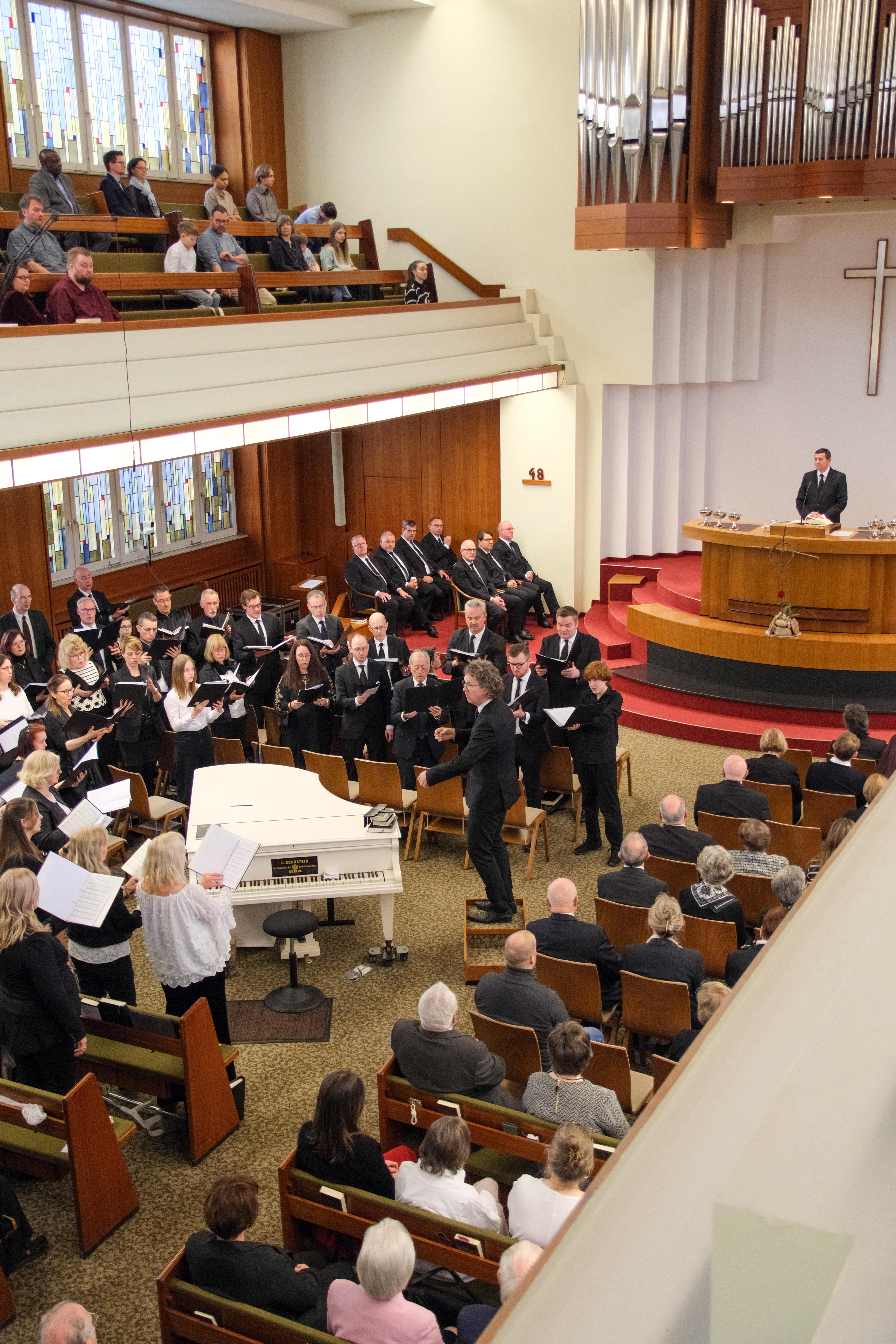 Es war eine besondere Stimmung, die diesen Karfreitag, den 3. April 2026, prägte: Still und feierlich, getragen durch liebevoll ausgewählte und kunstvoll vorgetragene Musik erwarteten die Geschwister der Gemeinde Berlin-Charlottenburg sowie in den Übertragungsgemeinden Bezirksapostel David Heynes. Die Gottesdienstfeier fügte sich übergangslos in diese Atmosphäre ein. Ihr zugrunde lag das Wort aus Johannes 19,30.