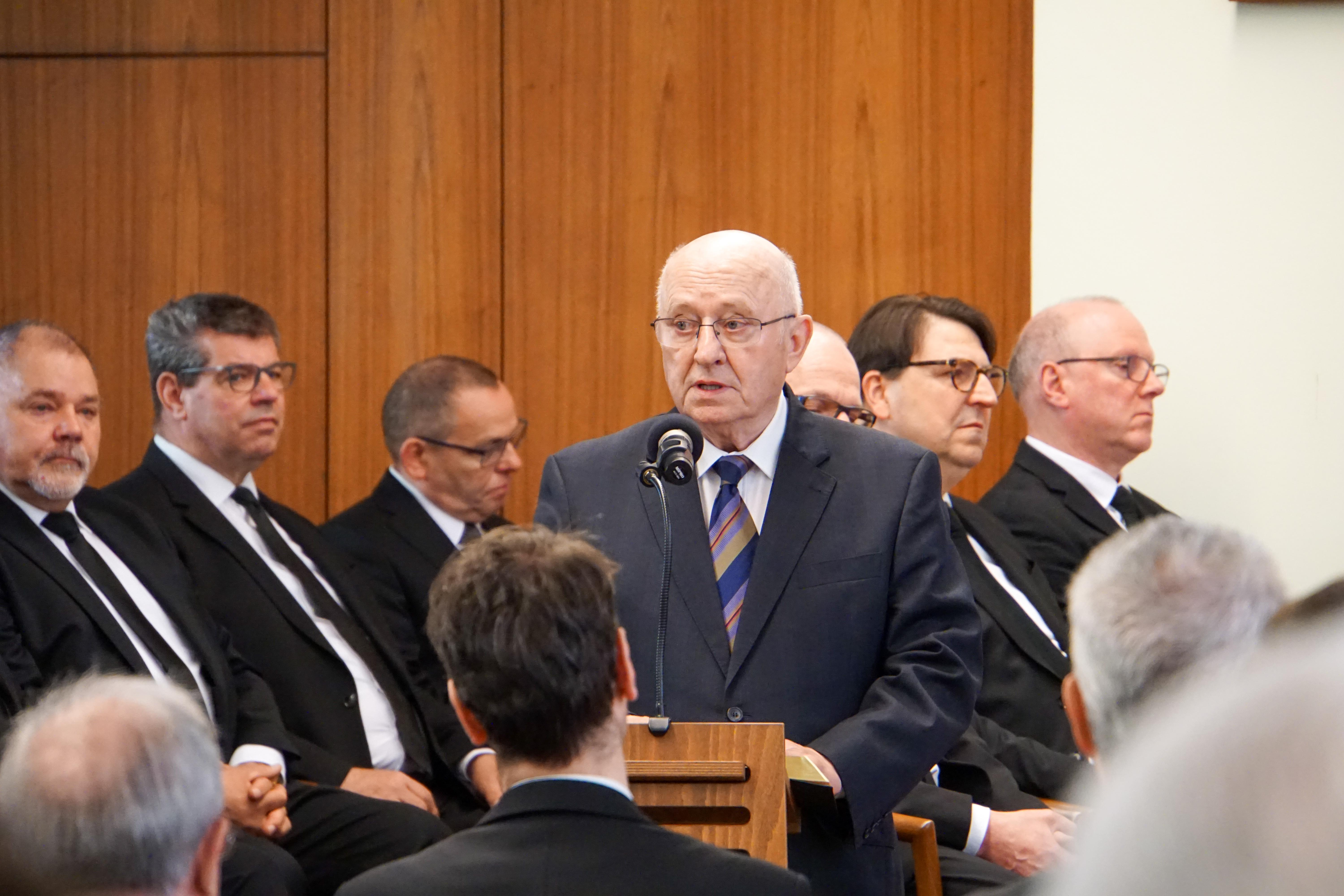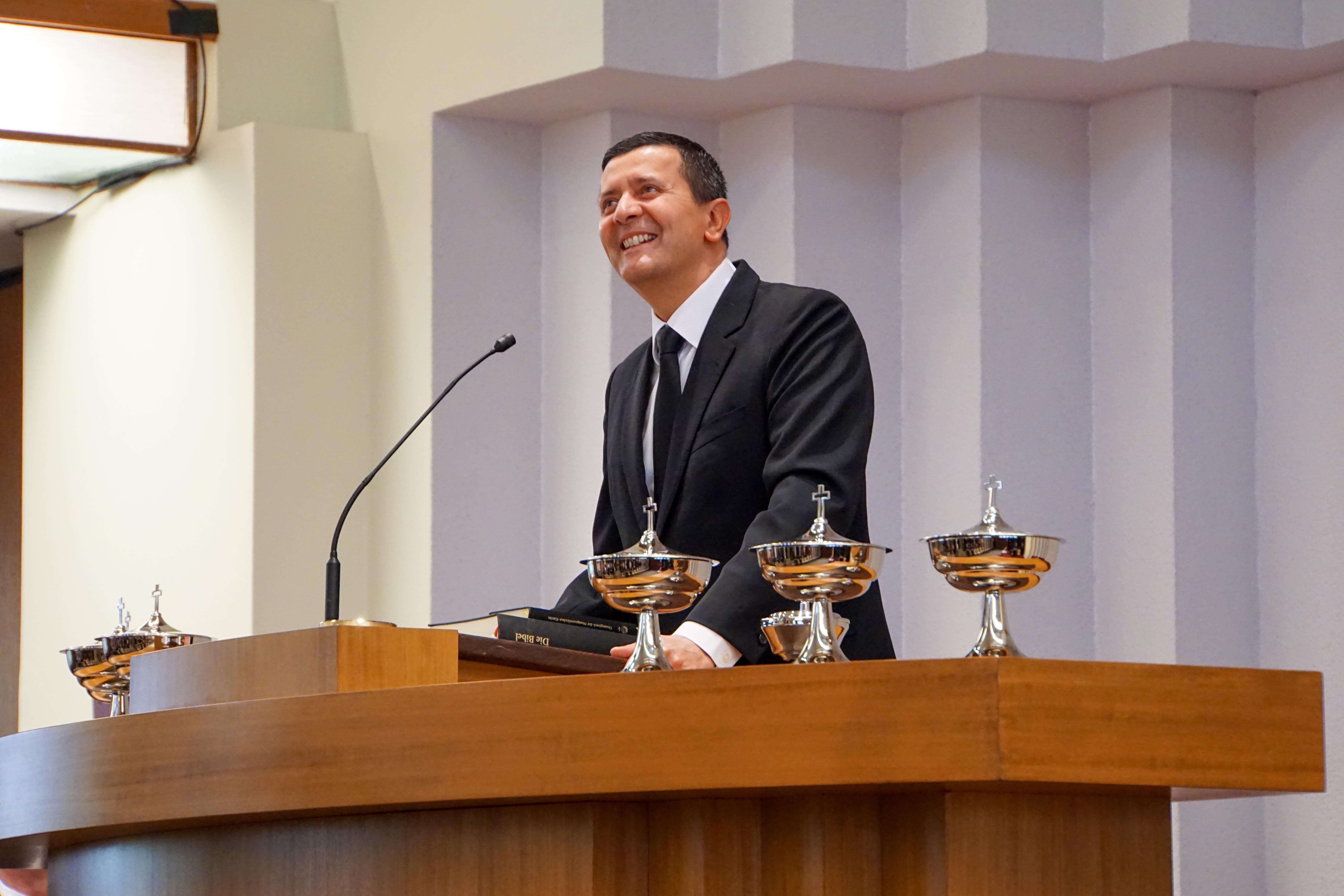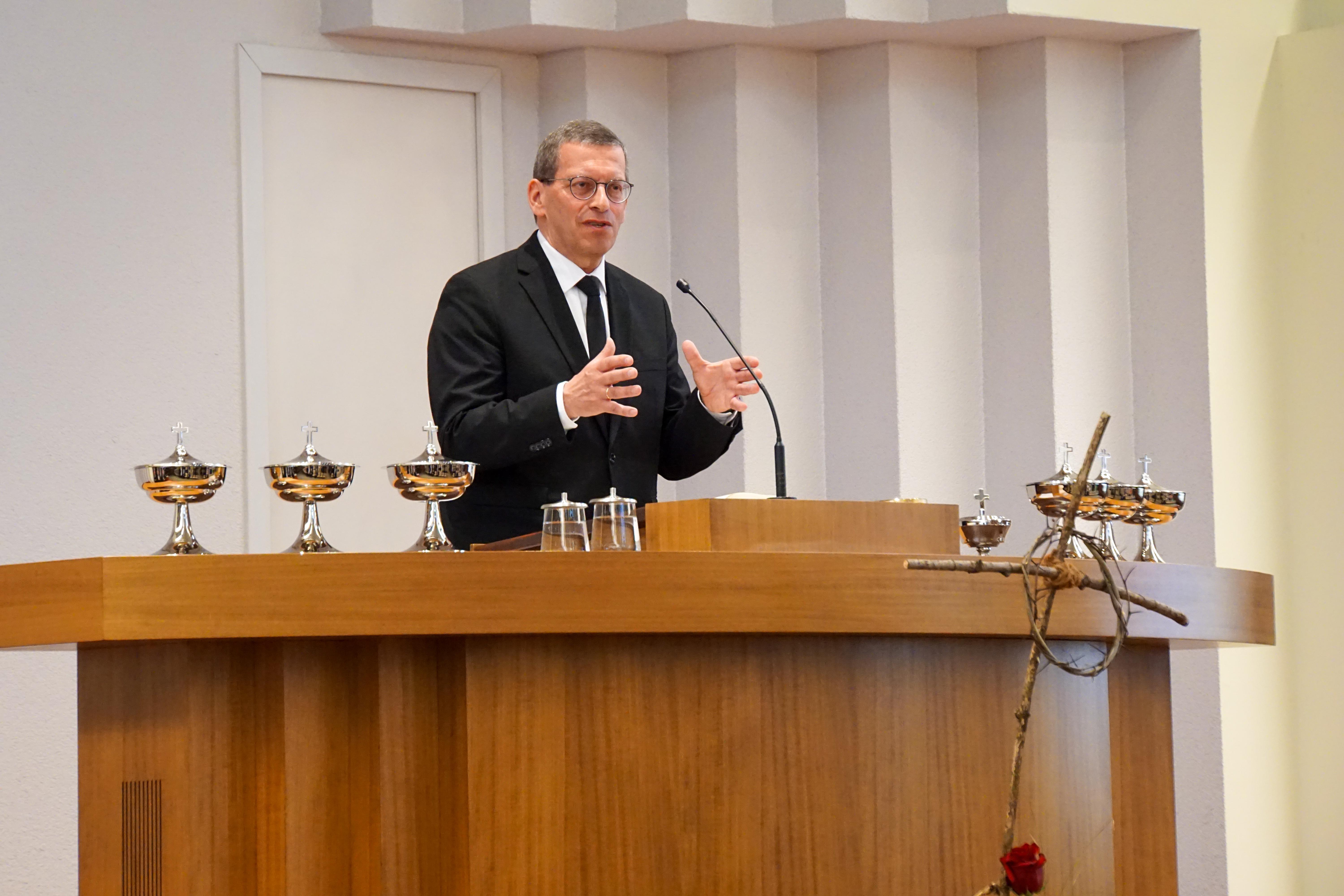 Schon in seinem Eingangsgebet stellte Bezirksapostel Heynes in den Mittelpunkt, dass es uns ein Anliegen sei, an diesem heiligen Tag die Nähe zu Gott und insbesondere zu Jesus aufzusuchen, die uns Freude, Hoffnung und Zuversicht schenken und tiefe Dankbarkeit verleihen würde. Nach der Bibellesung aus dem Markusevangelium, vorgetragen durch Apostel i. R. Berndt, legte der Bezirksapostel den Fokus seines Dienens darauf, wie dankbar wir Jesus Christus sind, dass er sein Leben für uns gegeben hat und uns damit den Weg gezeigt hat, der uns zu Gott führen wird. Dabei habe er zunächst die bisherigen Verheißungen erfüllt, beispielsweise indem er um etwas zu trinken bat und Essig erhielt, so wie es in den Psalmen beschrieben ist. So, wie Jesus damit die Versprechungen Gottes gehalten habe, werden auch seine Zusagen für uns und unsere Zukunft Bestand haben.