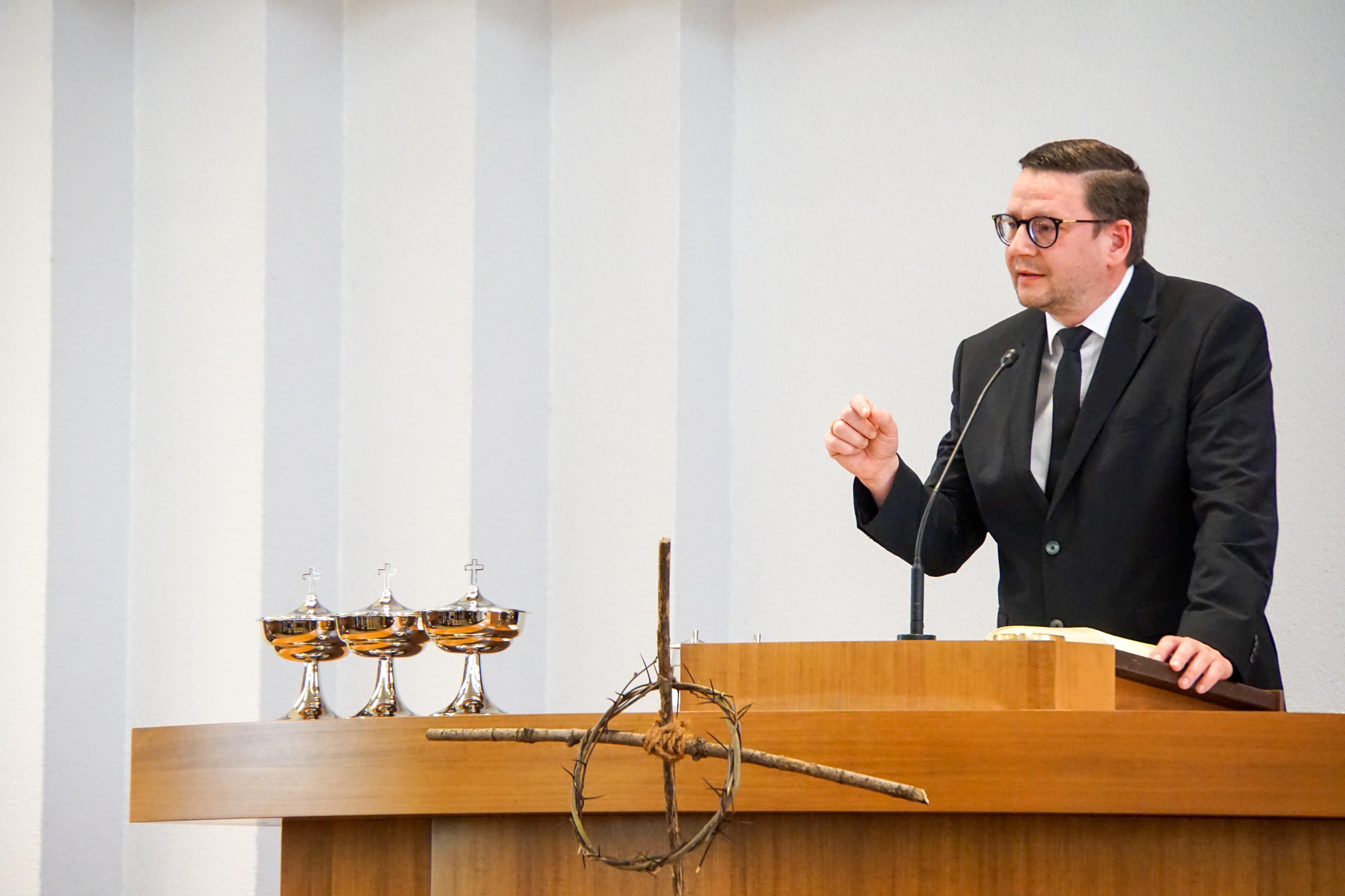 Als Mitdienende rief Bezirksapostel Heynes zunächst Priester Karaus aus dem Bezirk Rostock, der dort als Bezirksvorsteherstellvertreter eingesetzt ist. Dieser legte den Schwerpunkt seiner Predigt auf die Worte Jesu „Es ist vollbracht.“ und betonte die besondere Bedeutung, dass der Lebensweg nicht nur beendet, sondern vollkommen erfüllt worden sei. So, wie die Voraussagen aus dem Alten Testament alle von Jesus gehalten wurden, so sei sein Tod am Kreuz die Vervollkommnung des perfekten Wegs zu unserer Erlösung. „Blicke auf Christus und du wirst erkennen: Diese Sünde, diese Macht der Sünde hat kein Anrecht an deiner Seele. Was für ein tröstlicher Gedanke.“ Priester Karaus führte im Weiteren den Moment vor Augen, als Jesus seine Mutter Maria und einen der Jünger als Mutter und Sohn miteinander verband, und rief die Gemeinde dazu auf, dies als Aufforderung an uns selbst zu verstehen die Nöte und Bedürfnise der Menschen um uns herum wahrzunehmen und somit sein Werk weiterzuführen.